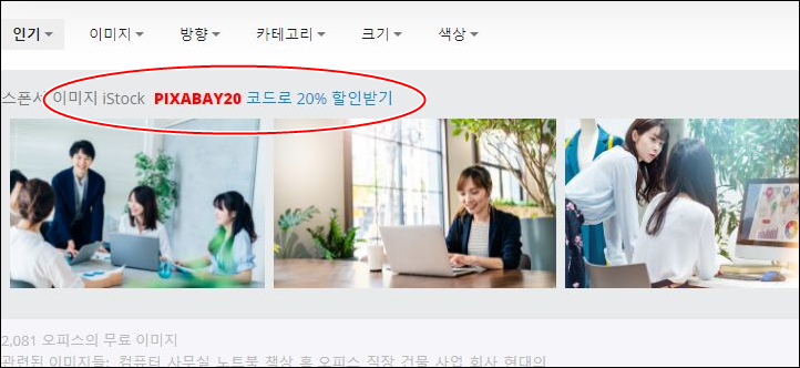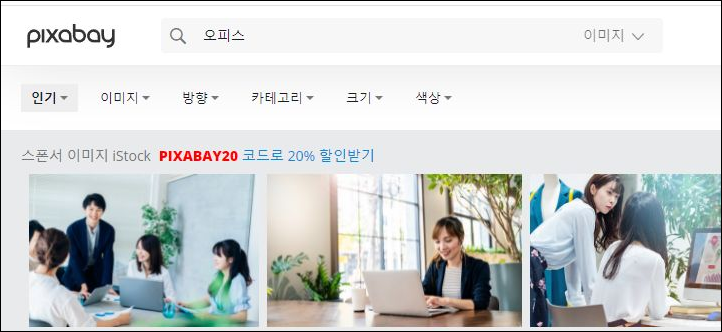 픽사베이는 영문 검색 뿐만 아니라 한글 검색도 지원하므로 편리하게 사용할 수 있습니다. 예를 들면, 오피스 office 둘 다 검색이 가능합니다. 다만, 한글의 경우 인식 범위가 영어보다 적을 수 있습니다.